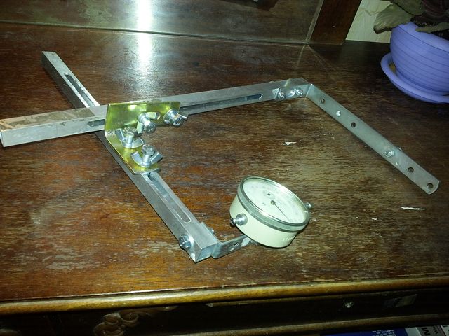 Собственно вот мой рукотворный шедевр для измерения биения дисков и ступицы. Крепил к амортизатору строительными хомутами с винтом-барашком.