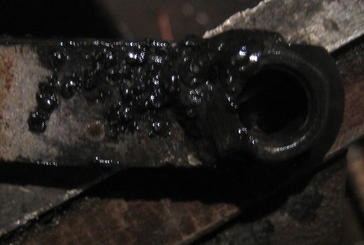 Вварной гайки не было под левым нижним болтом подушки (см. фото выше). Рядом с ним виден болт поменьше - это как раз тот самый болт, который крепит хвост "вварной гайки". Все держится крепко и, как показал опыт, за полгода нахождения в сырых условиях, изготовленная конструкция благодаря обработке кислотой даже не собралась ржаветь. Так была решена первая проблема.