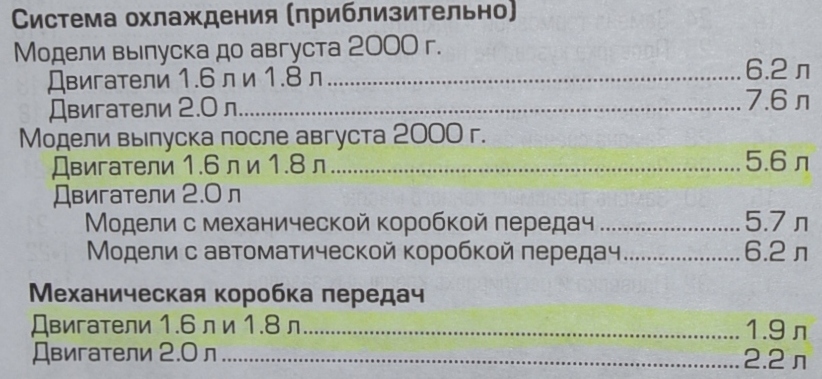 Подскажите хотя бы объем системы охлаждения у кого книга под рукой, у меня в другом городе осталась.