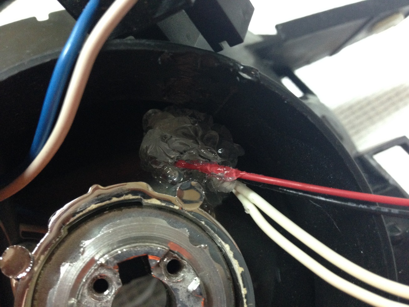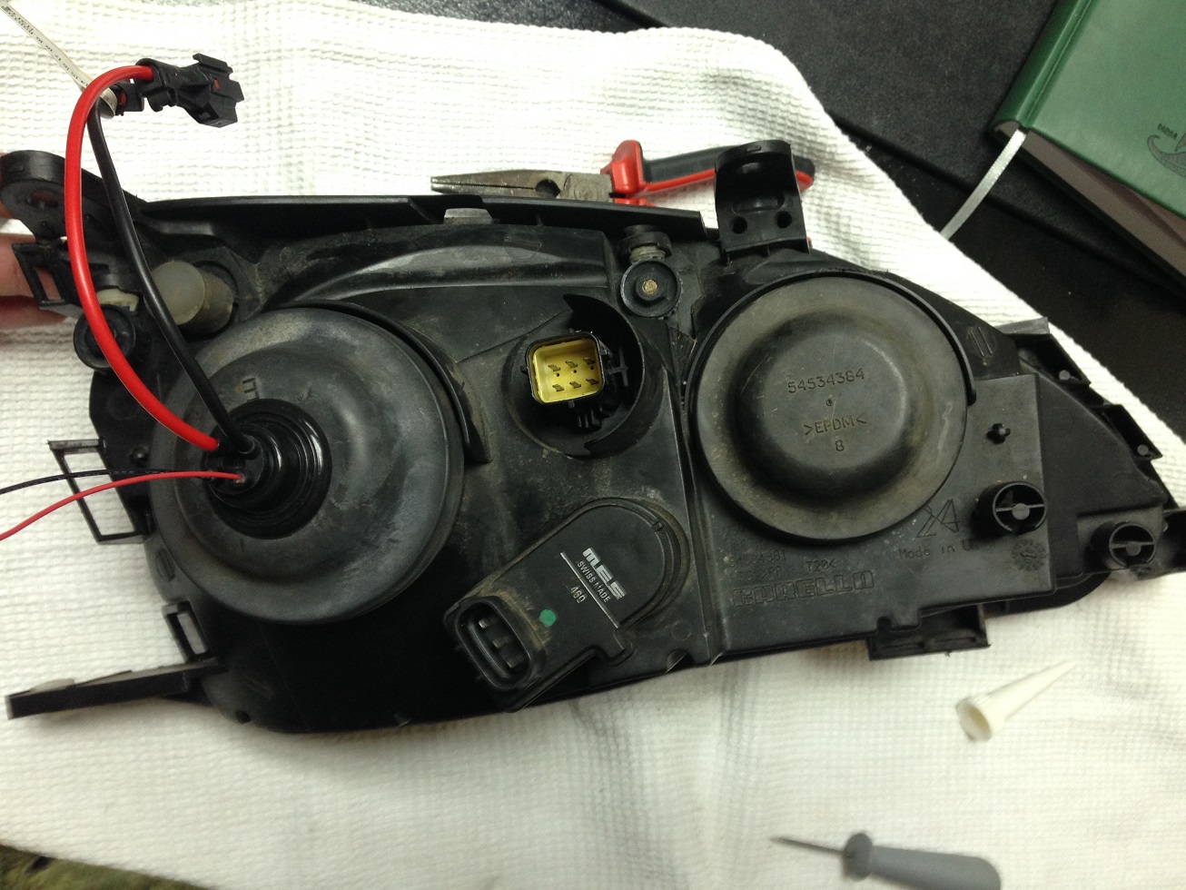 после всех манипуляций фара сзади выглядит так,не хватает двух проводов которые уже на авто.в родной заглушке фары сделал отверстие в которое вставил резинку от лампы.