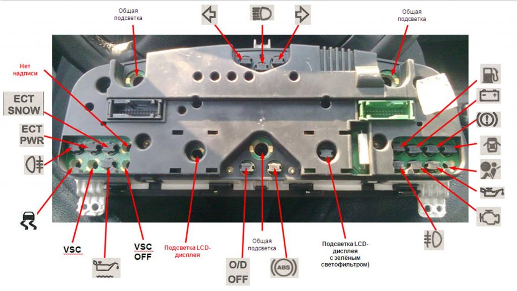 там явно кто то частично вытащил!!! вверху по центру нет лампы дальнего света, В правом углу на сколь помню подушки безопасности лампа стоит, по центру внизу лампа овердрайв, вторую не помню, в левом углу две лампы режимов коробке ектив повер и ектив сноу, ещё одна уровень масла (желтая масленка) остальные не помню...