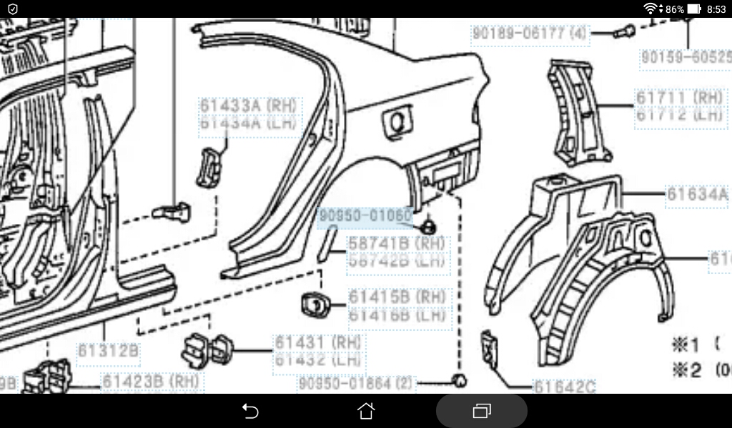 Кузовные детали, экстерьер, интерьер -> Боковые компоненты кузова. По схеме слева указана, но на седане, если не изменяет память (могу ошибаться), слева этой заглушки нет. Артикул 90950-01060 или 90950-01866 Заглушка обшивки багажника.