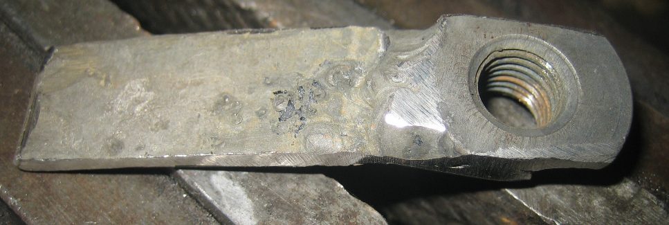 Идея вот в чём. Большое усилие к вварной гайке должно прикладываться только в одном направлении - снизу вверх. Поэтому принципиально можно было бы вообще просто подсунуть гайку и закрепить подушку (ниже в лонжероне есть родное отверстие, через которое можно подсунуть гайку на нужное место). Но проблема возникнет потом, когда надо будет подушку ДВС снять: гайка упадёт в лонжерон. Поэтому задача не в том, чтобы крепко закрепить гайку, а в том, чтобы закрепить её всего лишь от падения. Поэтому можно приделать к гайке хвост, просверлить в лонжероне и хвосте отверстие, нарезать резьбу в хвосте и болтом закрепить хвост. Так и было сделано. На предыдущих фотографиях хвост у гайки без отверстия, т.к. его я сверлил прямо на месте и там же нарезал резьбу.